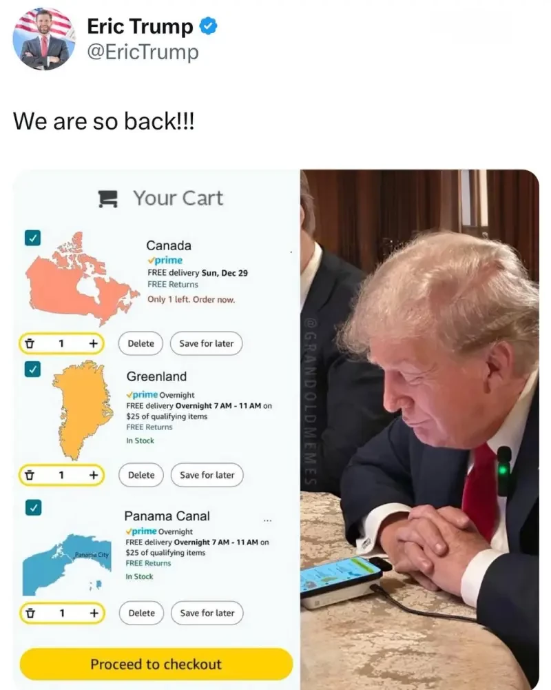 Как бы там ни было, сын Трампа решил «подлить масла в огонь» и опубликовал у себя в соцсети пост, где изображается корзина в интернет-магазине, в которой находятся Канада, Гренландия и Панамский канал.