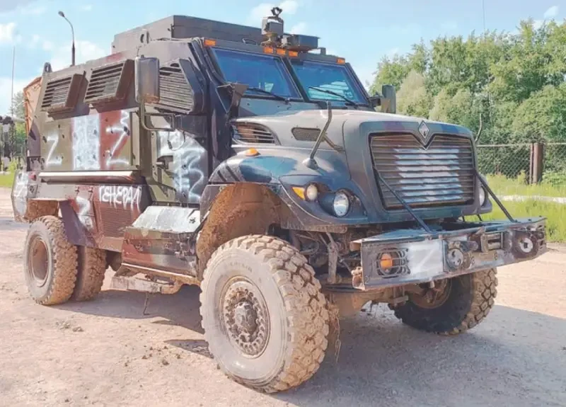 Общий вид защищенного автомобиля International MaxxPro Plus. Источник: статья «Ценные трофеи. Особенности конструкции трофейных бронированных автомобилей» в журнале «Материально-техническое обеспечение Вооруженных Сил Российской Федерации» №2, 2024.