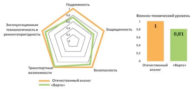 Диаграмма сравнительного анализа ВТУ бронированного автомобиля «Варта» и отечественного аналога. Источник: статья «Ценные трофеи. Особенности конструкции трофейных бронированных автомобилей» в журнале «Материально-техническое обеспечение Вооруженных Сил Российской Федерации» №2, 2024.