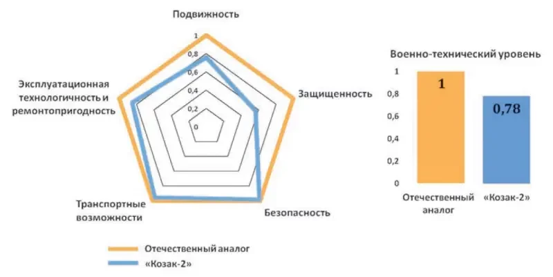 Диаграмма сравнительного анализа ВТУ бронированного автомобиля «Козак-2» и отечественного аналога. Источник: статья «Ценные трофеи. Особенности конструкции трофейных бронированных автомобилей» в журнале «Материально-техническое обеспечение Вооруженных Сил Российской Федерации» №2, 2024.