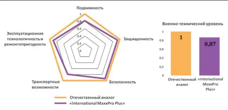 Диаграмма сравнительного анализа ВТУ бронированного автомобиля International MaxxPro Plus и отечественного аналога. Источник: статья «Ценные трофеи. Особенности конструкции трофейных бронированных автомобилей» в журнале «Материально-техническое обеспечение Вооруженных Сил Российской Федерации» №2, 2024.
