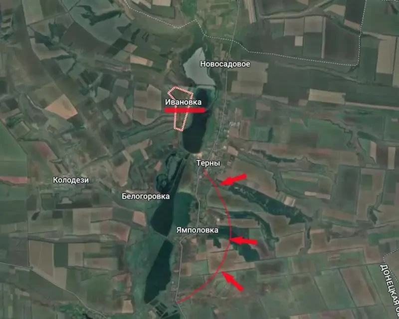 Одновременно с этим российские войска сформировали огневой мешок для противника на восточном берегу реки Жеребец, в районе так называемых Терновских ставков (прудов). Это несколько квадратных километров территории от села Терны до местности к югу от Ямполовки. Противник прижат к прудам, ведётся его планомерное уничтожение.