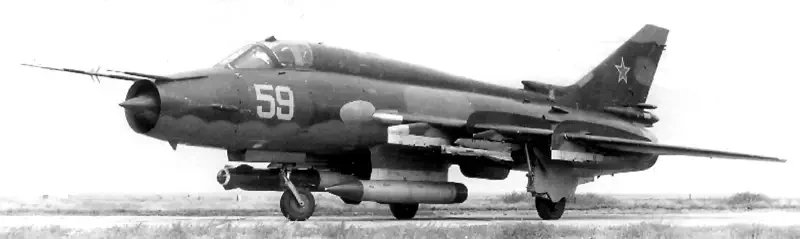 Су-17М4 в качестве носителя ракеты Х-59. Под фюзеляжем подвешен контейнер АПК-9, ракета — под правой плоскостью. Фото MilitaryRussia.ru