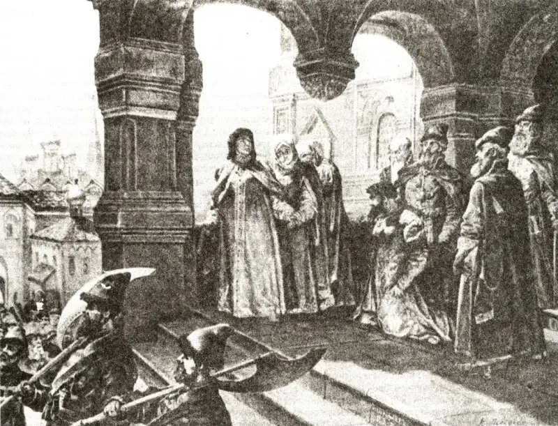 «В царских хоромах «на верху» появилось подметное письмо, в котором предостерегали царевну, что ночью с 7-го на 8-е августа явятся из Преображенского «потешные» царя для убиения царя Ивана Алексеевича и всех его сестер. Шакловитый вечером 7-го августа призвал четыреста стрельцов с заряженными ружьями в Кремль, а триста поставил на Лубянке. Его подручники начали наущать стрельцов, что надобно убить «медведицу», старую царицу, а «если сын станет заступаться за мать, то и ему спускать нечего».