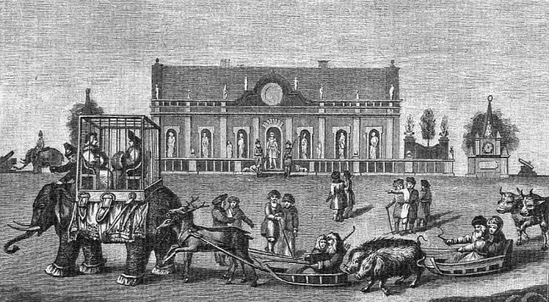 Наржо. Ксилография «Фасад Ледяного дома и процессия шутовской свадьбы Михаила Голицына и калмычки Бужениновой». 1740 г.