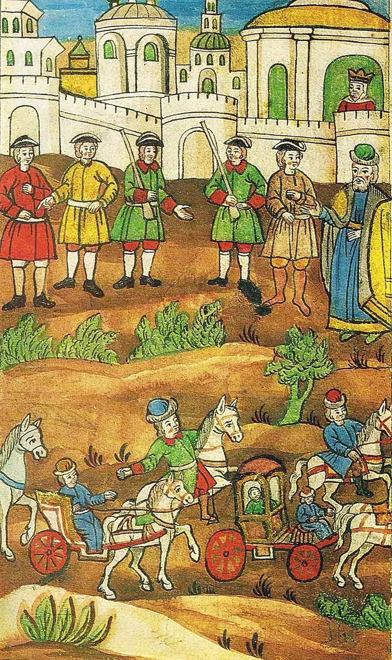 Заточение царевны Софьи в Новодевичий монастырь в 1689 г. Миниатюра из рукописи П. Крёкшина «История Петра I», первая половина XVIII века.