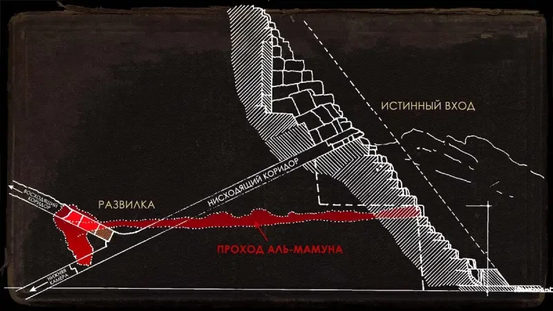 В Каире Халиф аль-Мамун провёл 47 дней, причём всё это время трудился не покладая рук. То есть руками-то он, понятно, не работал, а указывал, что и как делать. В 820 году он пригнал к пирамиде Хуфу множество людей, начиная с инженеров и заканчивая каменотёсами, и повелел им отыскать вход в пирамиду. Искали они его искали, да так и не нашли. И тогда аль-Мамун, как считают, приказал разводить на поверхности каменной облицовки пирамиды костры, а раскалившийся известняк поливать винным уксусом, отчего тот трескался и крошился. Затем пирамиду долбили таранами. И вот так, шаг за шагом рабочие халифа начали углубляться в пирамиду и сумели пробить в ней практически 30-метровый туннель. И пробились-таки в узкий ход, по которому и пошли, «преодолевая тьму, которая страшила взоры и была труднодоступна для прохождения». Ширина хода была немногим больше метра, да и высота такая же, а ещё он шёл вниз под углом в 26 градусов. Пришлось двигаться по нему на четвереньках, причём вместе с рабочими в этот ход полез и сам аль-Мамун. По «Нисходящему коридору» (он теперь так и называется) они спустились до конца и оказались в «яме», полной обломками камней и пыли. Судя по копоти от факелов, тут кто-то уже побывал до них, очевидно, что ещё в античные времена.