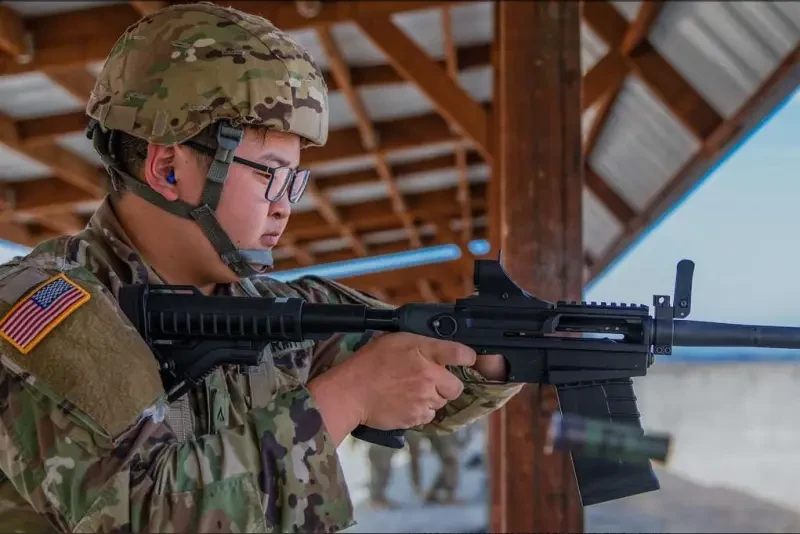Солдат армейского резерва Армии США во время учебных стрельб из дробовика М26, 2020 год. На фото запечатлён процесс перезарядки оружия и момент экстракции стреляной гильзы. Хорошо видно, что для того, чтобы перезарядит дробовик, надо убрать руку с горловины магазина, за которую происходит удержание, отвести затвор за рукоятку назад, потом закрыть затвор, дослав новый патрон из магазина в патронник и потом только вернуть руку на шахту магазина, вернувшись к нормальному стабильному удержанию оружия. Удастся ли при такой системе ручного перезаряжания вести быстрый и точный огонь по быстро перемещающимся воздушным целям, да ещё и на минимальных дистанциях – вопрос более чем открытый.
