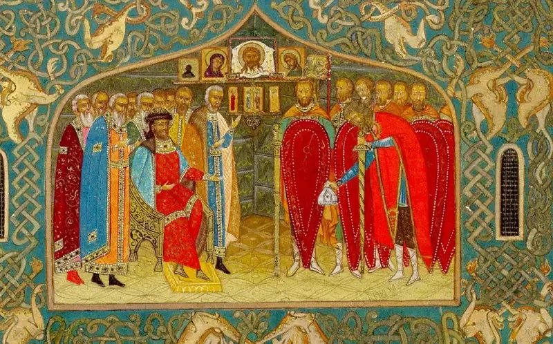 Прибытие Гландо Камбилы в Новгород. Миниатюра из «Летописного и Лицевого Изборника Дома Романовых» 1913 года