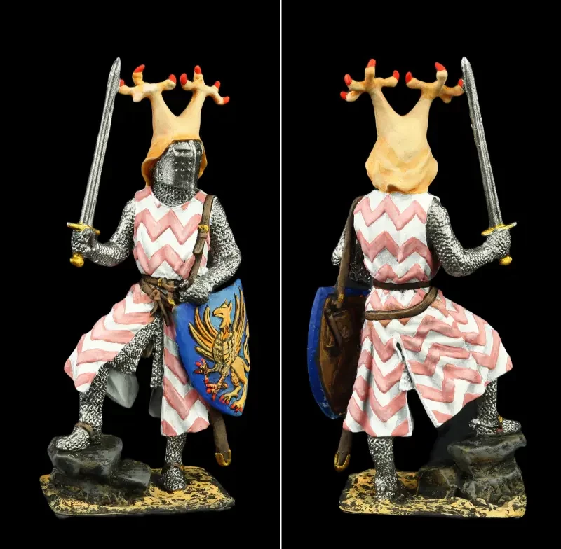 Рыцарь-миннезингер Генрих фон Теттинген. Интересно, что вооружён он фальшионом (фелсеном), а меч висит на поясе. Очень оригинальны и его нашлемные украшения – два серпа и такой серп, то есть гербовое изображение серпа на щите. Всё это лишний раз говорит о том, что символы земледельческого труда никуда из рыцарского обихода не ушли, а сам труд земледельца был в достаточной степени почитаем. О чём, кстати, у нас на Руси свидетельствует былина о Вольге и Микуле Селяниновиче. Только у нас об этом говорилось вслух, а на Западе демонстрировалось на уровне символов. Фигурка ЕК Castings и Silver Dream Studio