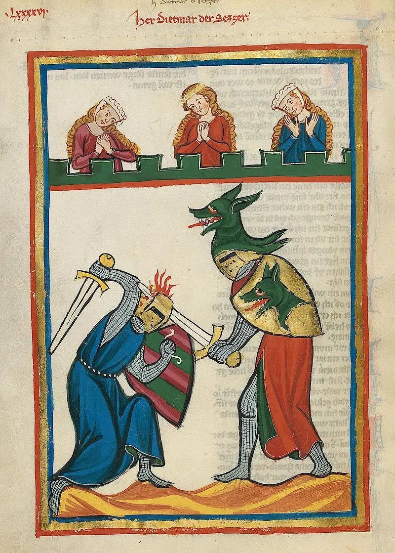 Дитмар дер Сетцер, XIII в. На иллюстрации представлен участником пешего рыцарского поединка, причём на острых мечах. И, видимо, острота и прочность последних была такова, что он разрубил своему противнику шлем вместе с головой. Герб – зелёная волчья голова. Поэтому такая же фигура украшает и его рыцарский шлем. «Манесский кодекс»