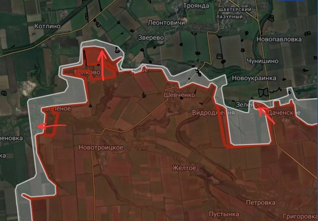 Российские войска расширили контроль территории в районе Зелёное, западнее Песчаное и Нововасилевки. ВС РФ ведут зачистку Петропавловки.