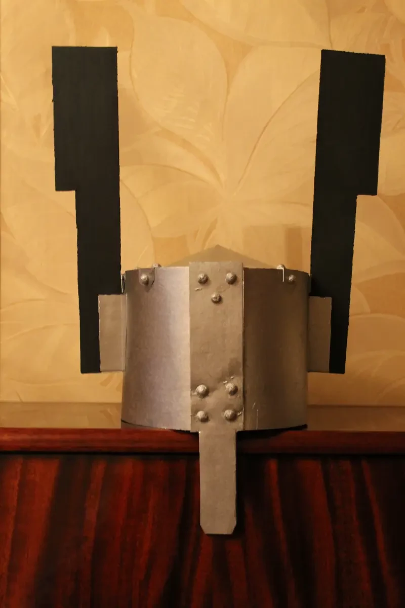Шлем с топорами. Реконструкция автора. Дело в том, что в «Манесском кодексе» Вольфрам фон Эшенбах изображён в закрытом рыцарском шлеме. Однако такие шлемы появились несколько позже его смерти. Скорее всего, если уж надевать на него шлем с клейнодами в виде топоров, следует учитывать эпоху. Как раз в начале XIII века в моде были шлемы «таблетки» или «шлемы-кастрюли», либо цилиндрической формы, либо несколько расширяющиеся кверху и с коническим дном. «Ручка» такой «кастрюли» отгибалась вниз и служила наносником. Шлем целиком и полностью сделан из упаковочного картона и покрашен из аэрозольного баллончика. Закрепки отформованы из… хлебного мякиша и тоже покрашены. Данная самоделка использовалась в летнем лагере фирмы «Ростум», во время проведения там «рыцарской смены»…