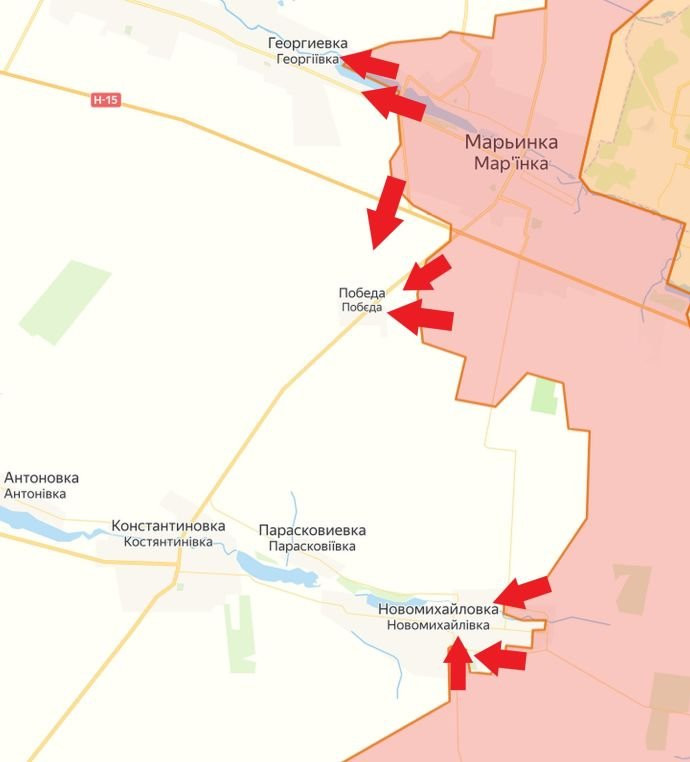 На Донецком фронте российские войска штурмуют Новомихайловку. Бои в самом посёлке. При поддержке артиллерии ВС РФ атаковали в районе Георгиевки. ВСУ удерживают позиции. Попытка прорвать украинскую оборону у Невельского и Первомайского.