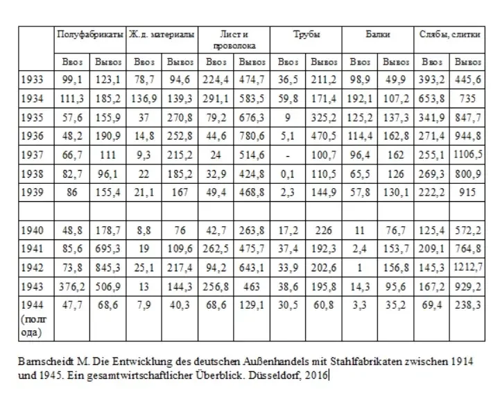 Оказывается, всё то время, перед войной и во время войны, Германия активно торговала металлопрокатом: заготовки, балки, железнодорожный материал, проволока. Причём гораздо больше продавала, чем покупала.