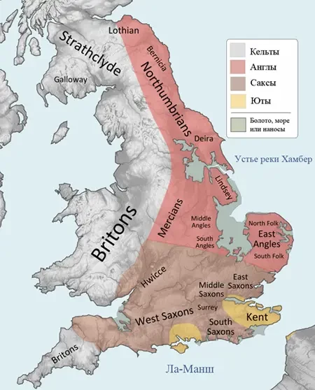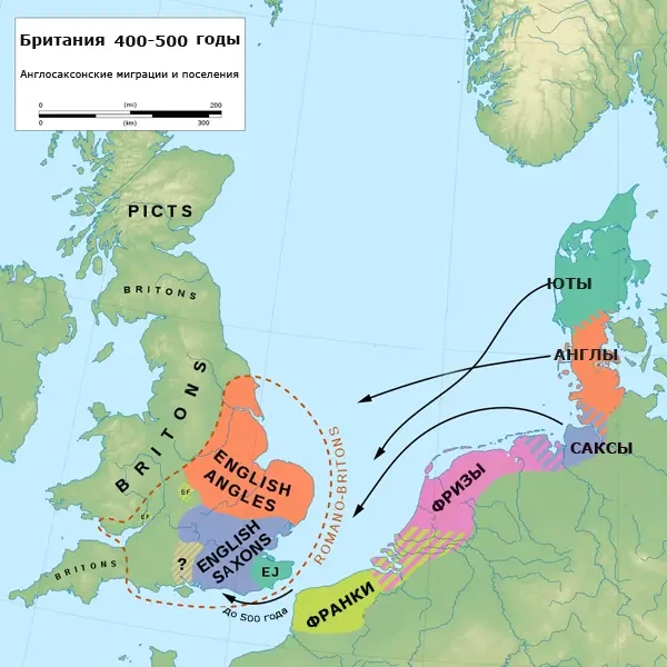 И вот на протяжении почти полутора веков (с середины V до конца VI века), вслед за военными дружинами из Ютландии, и испытывая сильное давление данов (племя из Южной Скандинавии), на остров начинают переселяться племена англов, саксов и ютов, которые в итоге, сломив сопротивление живших там бриттов, и сформировали ядро самых ранних английских королевств. Однако, насколько далеко простирались эти ранние королевства вглубь страны, остается открытым вопросом.