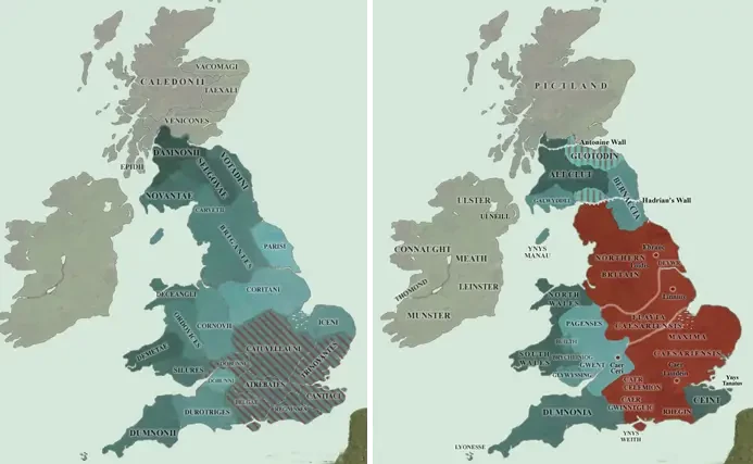 Слева: карта Британии 43-425 гг. н.э. Слева: карта ранней независимой Британии 400-425 гг. н.э.