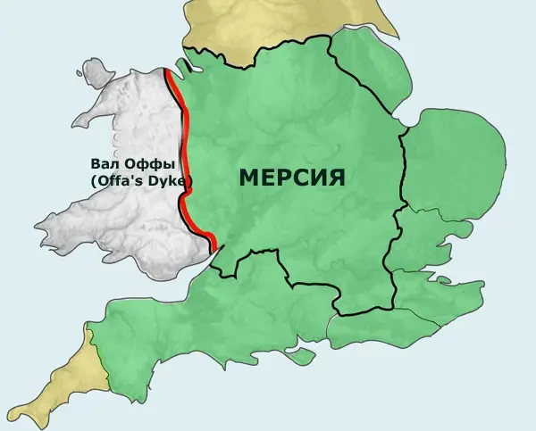 После победы над Нортумбрией, с середины VII века и на протяжении всего VIII века, господствующее положение в Британии переходит к Мерсии — еще одному из семи варварских королевств так называемой англосаксонской Гептархии. Территориальные владения Мерсии начинают серьезно увеличиваться благодаря победоносным войнам мерсийских правителей и поддержке их политики тогда еще языческим англосаксонским населением, для которого прежний языческий культ и старые обряды были более понятнее и привычнее новой насаждаемой в Британии христианской религии.