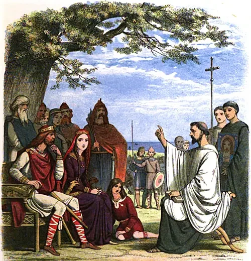 Иллюстрация проповеди Святого Августина королю Этельберту и королеве Берте из «Хроники Англии». Художник: Джеймс Уильям Эдмунд Дойл. ХIХ век