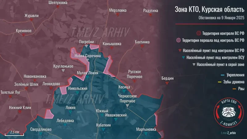 К северу от Суджи наши наступают широким фронтом от села Кругленькое, выйдя к реке Малая Локня и закрепившись в селах Старая и Новая Сорочина, а также выйдя на окраины Викторовки и Никольского. Навстречу штурмовые отряды идут через Русское Поречное, находящееся под нашим контролем. Цель — перерезать трассу Суджа — Льгов, тем самым взяв в оперативное окружение украинскую группировку в районе Погребков.