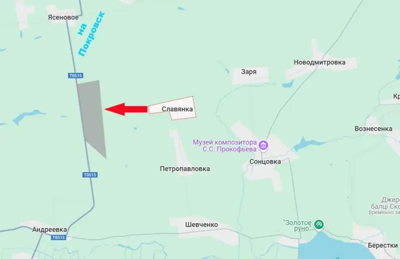По состоянию на текущий момент ВС РФ продвинулись на расстояние до 1,5 км западнее освобождённого ранее населённого пункта Славянка. Одновременно с этим на запад сдвинулась и так называемая «серая зона». Теперь она доходит до важной для противника автомобильной дороги Т0515, соединяющей Покровск с селом Константинополь. Северная часть этой автодороги уже находится под физическим контролем армии России. Теперь же противник потерял контроль и над одним из её участков между сёлами Ясеново и Андреевка, что к югу от Покровска.