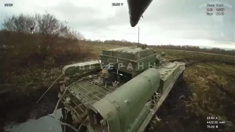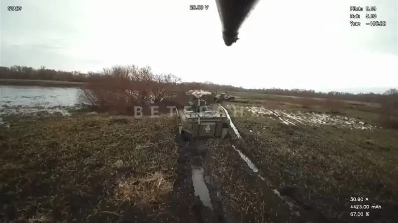 На снятых в приграничье Сумской и Курской областей кадрах российские FPV-дроны с поразительной точностью поражают военную технику ВСУ, увязшую в ставших абсолютно непроходимыми вследствие теплой погоды и отсутствия традиционных зимних морозов полях России.