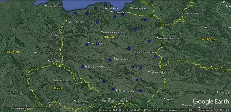 Схема размещения на территории Польши стационарных Командных пунктов ПВО и Центров координации воздушных операций