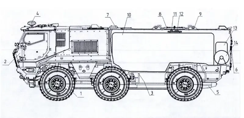 «Цистерна для горючего и технологическое оборудование установлены и жестко зафиксированы внутри бронированного корпуса российской бронированной машины на базе тяжелой универсальной гусеничной платформы Т-15 «Армата». Особенность бронирования данного топливозаправщика заключается в расположении экипажа с органами управления в изолированной бронекапсуле, отделенной от остальной части бронированной переборкой. Отсек моторно-трансмиссионного отделения также отделен бронированной переборкой от технологического оборудования. Предположительно, это делает бронированный топливозаправщик необычайно живучим даже в случае множественных повреждений брони. Броня с керамическими вставками поглощает энергию снаряда за счет разрушения керамического элемента и на перемещение остальных керамических элементов в плоскости брони, что приводит к преобразованию осевого ударного импульса в импульс в плоскости брони.»