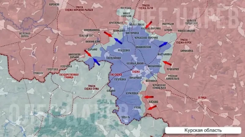 Авторы телеграм-канала «Северный ветер» обратили внимание, что на украинских ресурсах уже начали появляться сообщения о возможном окружении всей группировки ВСУ численностью до 2000 боевиков в районе города Суджа. Российские источники сообщают, что ВС РФ продолжают наступление на ключевом участке Курского направления: Малая Локня — Старая Сорочина — Погребки. Накануне российская армия отразила контратаку ВСУ в направлении хутора Бердин, за счет которой украинские силы пытались остановить наступление российских войск и вырваться из зоны блокирования.