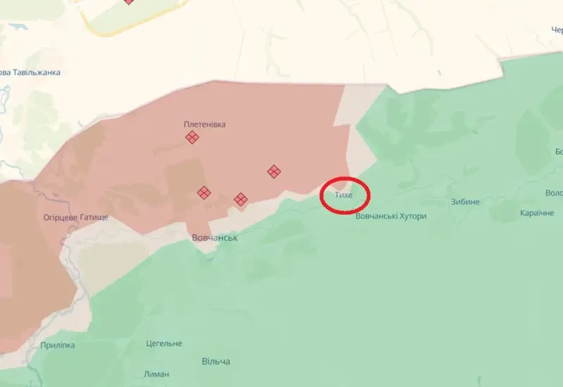 Одновременно с этим наши войска атаковали на севере Харьковщины. Речь идёт об участке фронта к востоку от Волчанска, где под контроль ВС РФ перешло около 3 квадратных километров территории в районе села Тихое.