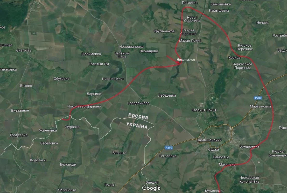 ВС РФ отбили и зачистили Николаево-Дарьино. Российские десантники продемонстрировали боевое знамя ВДВ в южной части села, протянувшегося вдоль дороги, ведущей к госгранице. Вслед за селом, наши зачищают окрестные лесопосадки, двигаясь вдоль границы.