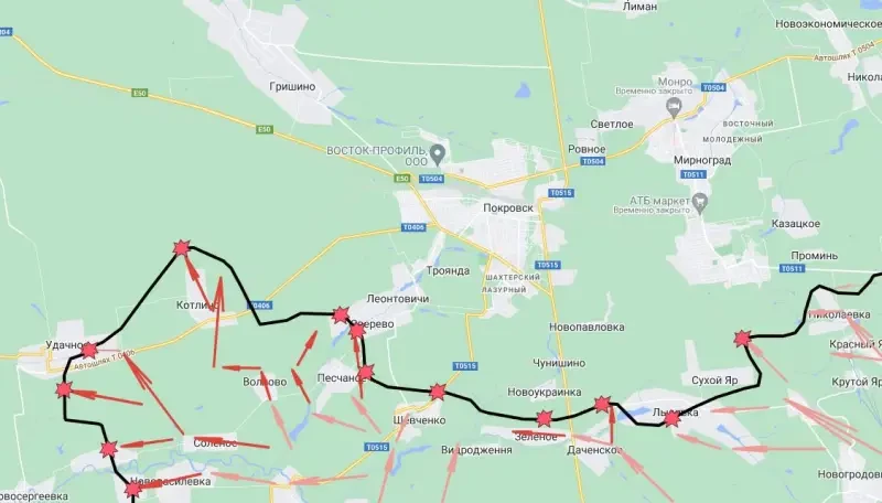 Передовые штурмовые подразделения российских войск предпринимают попытки обойти Покровск с западной стороны, тем самым перерезав одну из основных трасс снабжения, идущую на Днепропетровск. Украинские формирования пытаются не дать этого сделать, идут тяжелые бои. Тем не менее опасность прорыва с последующим охватом города существует и она весьма велика, у ВСУ просто не хватает сил и средств для длительной обороны.