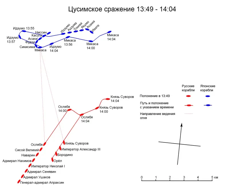 Схема маневрирования в Цусимском сражении 13:49-14:04