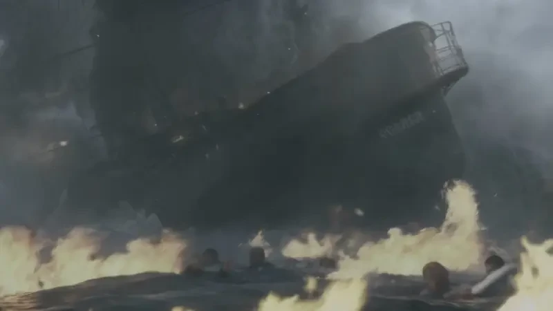 Попадание в броненосец «Князь Суворов». Кадр из фильма «Тучи над холмами»