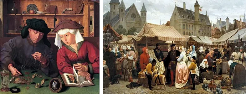 На фото слева: «Меняла с женой». Художник: Квентин Массейс (1465-1530). На фото справа: «Ярмарка в средневековом Генте». Феликс де Винье (1806-1862).