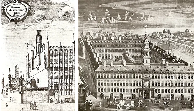 На рисунке слева: здание собрания Ганзейского управления в Брюгге, также называемое иногда Домом истерлингов. На рисунке справа: здание собрания Ганзейского управления в Антверпене. Иногда из-за неспокойной политической обстановки в Брюгге конторы Ганзы переезжали в Антверпен.