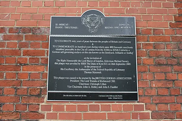 Чтобы отпраздновать шестьдесят лет мира между народами Британии и Германии и отметить шестьсот лет, в течение которых около 400 ганзейских купцов мирно проживали в лондонском Сити с XIII по XIX века, в немецком самоуправляемом анклаве, известном как «Стилъярд» или «Штальхоф», была установлена по заказу Британско-германской ассоциации эта мемориальная доска. По приглашению лорд-мэра Лондона, олдермена Майкла Сэвори, эта мемориальная доска была открыта герцогом Кентским 26 сентября 2005 года в присутствии посла Федеративной Республики Германия Томаса Матуссека. В конце мемориальной доски написана цитата, написанная Фридрихом Шиллером в драме «Вильгельм Телль», написанной им в 1804 году: Das Alte stürzt, es ändert sich die Zeit, und neues Leben blüht aus den Ruinen («Старое рушится, времена меняются, и новая жизнь расцветает на руинах»). Источник: London Remembers