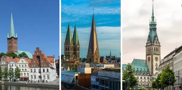 Современные Вольные Ганзейские города. Слева направо: Любек, Бремен и Гамбург