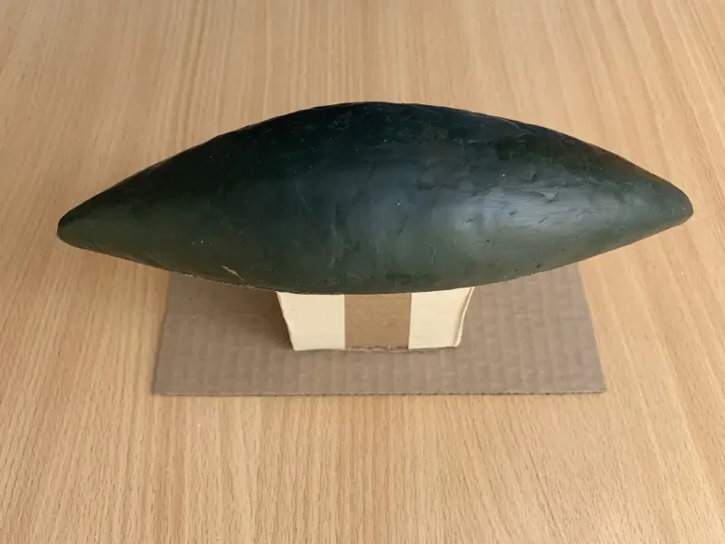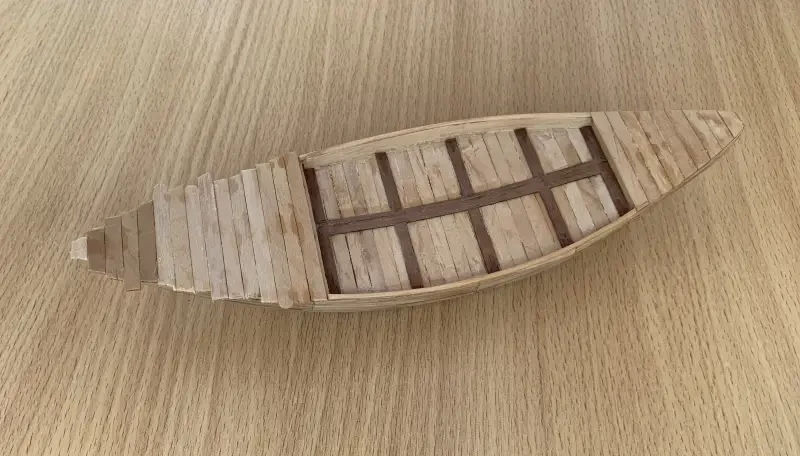 После того как палуба, наклеенная на упаковочный картон, была вырезана, на нее был наклеен профиль корпуса, также на картонном основании. Получился Т-образный профиль корпуса, к которому, а именно к палубе, была приклеена картонная «ручка» из нескольких склеенных между собой кусочков картона и такое же картонное основание. Все пространство между палубой и профилем корпуса было заполнено пластилином так, чтобы получился ровный седловатый корпус египетской ладьи.