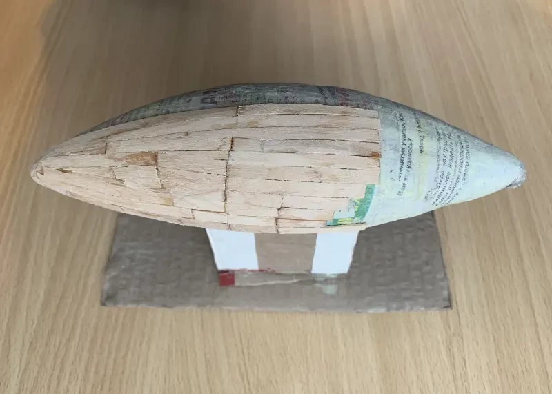 Теперь пластилиновый корпус в три слоя покрывается кусочками размоченной в воде газетной бумагой: первый слой только на воде, вторые два на клею ПВА. Хорошо просушив бумажную «скорлупу» и обрезав свисающие с корпуса края, оклеиваем ее палочками-мешалочками для кофе, стараясь по возможности укладывать их как можно плотнее. Клей – ПВА.