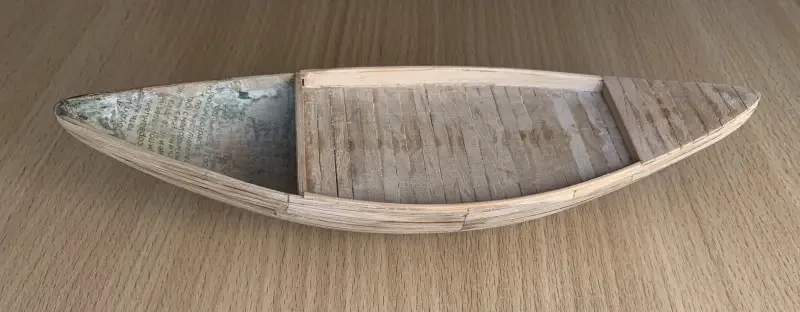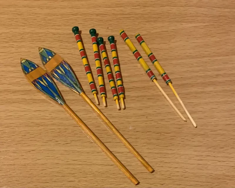Стойки навеса вытачиваются из подходящих по толщине деревянных брусков, а сами опоры тента можно сделать из сточенных до половины пластмассовых бусинок. Лопасти рулевых весел – из палочек-лопаток для мороженого, веретено весел – китайские зубочистки.