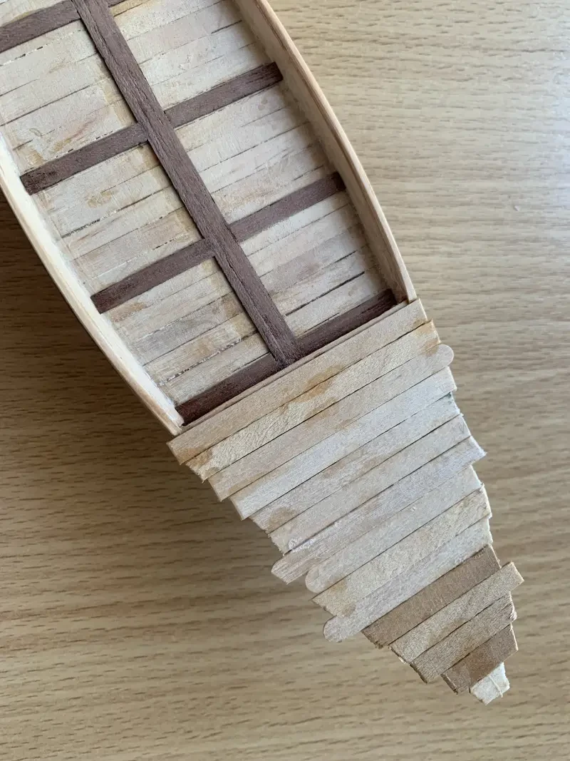 Вот так палочки-мешалочки обшивки укладываются на бумажную основу. Сгибать по профилю корпуса их вовсе не обязательно. Всю поверхность можно закрыть прямоугольными «кирпичиками», лишь немного обточив их края напильником, чтобы они плотнее подходили друг к другу.