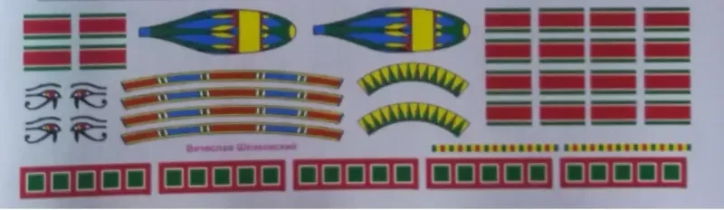 Поскольку и стойки рулевых весел, и сами весла, а также стойки тента и корпус судна были украшены сложными узорами, было решено не мучиться с их воспроизведением с помощью красок и кисточки, а заказать их декали, чтобы затем перевести их по месту. Благо сейчас проблем с этим нет никаких. В Интернете полно объявлений от фирм, которые готовы сделать тебе любые декали на заказ. Вот одна из таких фирм и сделала мне по фотографии египетской лодки и моим эскизам всё, что нужно для того, чтобы придать этой лодке нарядный и исторически достоверный вид.