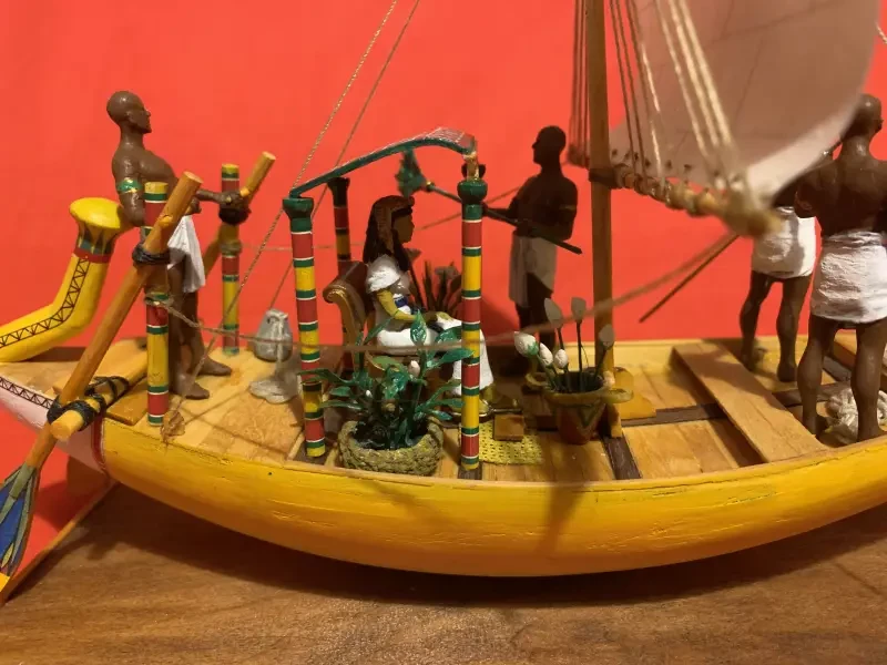 Пришлось полученные фигурки переделывать: отрывать им и переклеивать руки, менять позы, а в ногах высверливать отверстия и вставлять в них металлические штыри для прочного крепления на палубе. Затем последовал не менее сложный процесс их раскраски, однако в итоге всё получилось так, как было задумано. Экипаж ладьи уменьшился, но ее внешний вид от этого не пострадал. На нос были поставлены два гребца с длинными шестами, за ними позади надутого ветром паруса – опахолоносец с опахалом, под тентом в кресле расположилась дама на прогулке, а позади нее на помосте рулевой, управляющий двумя веслами.