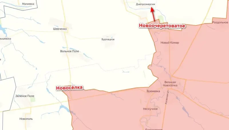 Враг при поддержке техники и средств РЭБ смог окончательно прорвать оборону и закрепиться в Новоселке. Сейчас деревня находится под контролем русских. Дальше пару км открытого участка и высоты, это линия, до которой они смогли дойти в начале. Также противник подавил оборону с помощью арты и дронов и закрепился в н. п. Новоочеретоватое, подойдя к Днепроэнергии.