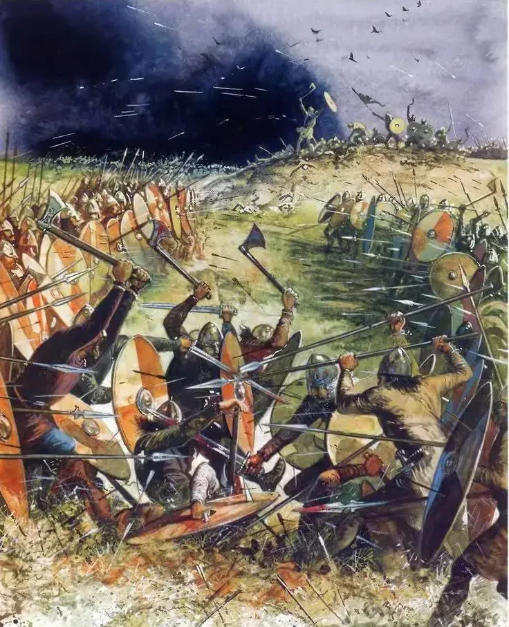 И с одной, и с другой стороны в составе сражающихся армий были лучники, но на тот момент ни англичане, ни их ближайшие родственники скандинавы это оружие не любили. Зато любили копья! Именно копьё указано как оружие большей части сражающихся, меч — оружие последнего шанса, за него берутся, когда копьё потеряно. При этом часто встречаются упоминания о метательных копьях — любовь англосаксов к дротикам известна.