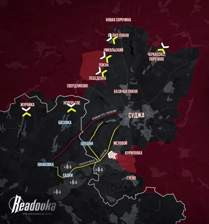 Южнее Суджи, в Куриловке, как сообщают с мест, завершилась зачистка от остатков соединений ВСУ, так же как и в урочищах у Куриловки. Тем самым ликвидирована еще одна линия снабжения ВСУ. Вооруженные силы России продолжают атаковать западнее, в районе поселка Меловой в сторону трассы на Суджу. За сутки противник дважды безуспешно контратаковал, понёс потери.