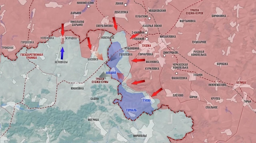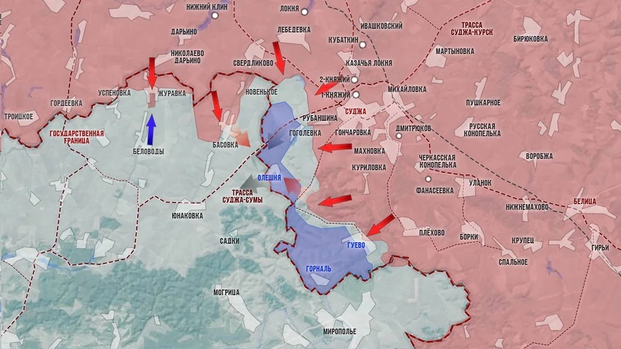Идут упорные бои за Олешню, куда ВС РФ наступают со стороны Холодного Яра. Наши смогли зайти на окраину, но ВСУ тут постоянно контратакуют. Тем не менее российские группы сумели продвинуться к пограничному пункту пропуска «Суджа», и по последним данным - заняли позиции на холме перед ним, сообщает в своём Telegram-канале Олег Царёв.