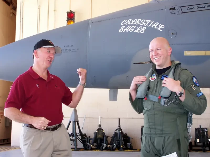 Отставной генерал-майор Дуг Пирсон (слева) и его сын капитан Тодд Пирсон (справа), пилот 390-й истребительной эскадрильи с авиабазы Маунтин-Хоум, штат Айдахо, посещают перед вылетом капитана Пирсона в памятный полет «Небесный орел» 13 сентября 2007 года на авиабазе резерва Хоумстед. Генерал Пирсон летал на точно таком же F-15 ровно 22 года назад, совершив единственное в истории успешное уничтожение спутника ракетой, запущенной с самолета. На момент фото самолет был приписан к 125-му истребительному крылу Национальной гвардии Флориды.