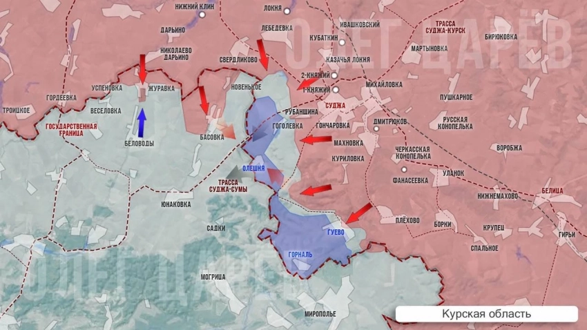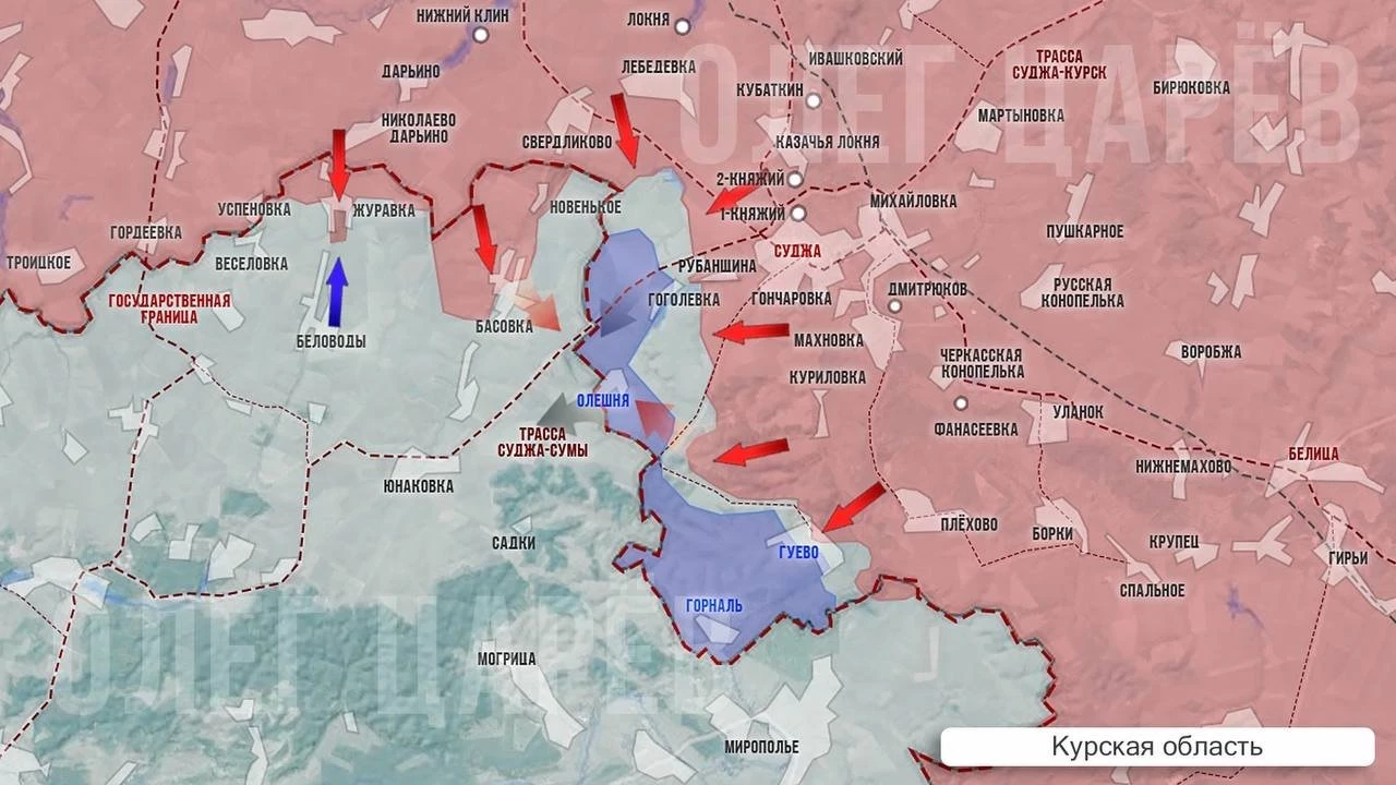 В Сумской области идут позиционные бои в Басовке, где наши части успешно закрепились, но противник пытается выбить российские группы с этих позиций и подтягивает резервы, отмечает в Telegram-канале Олег Царёв.